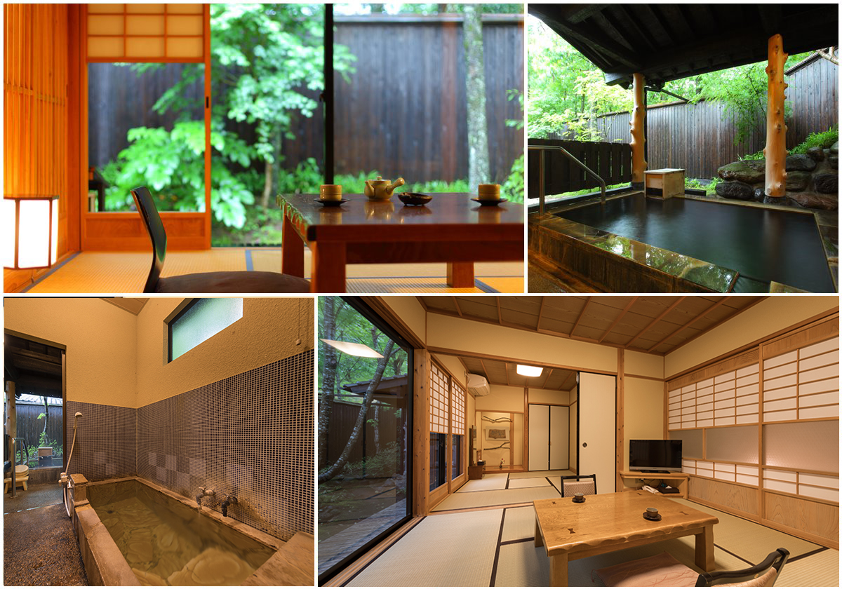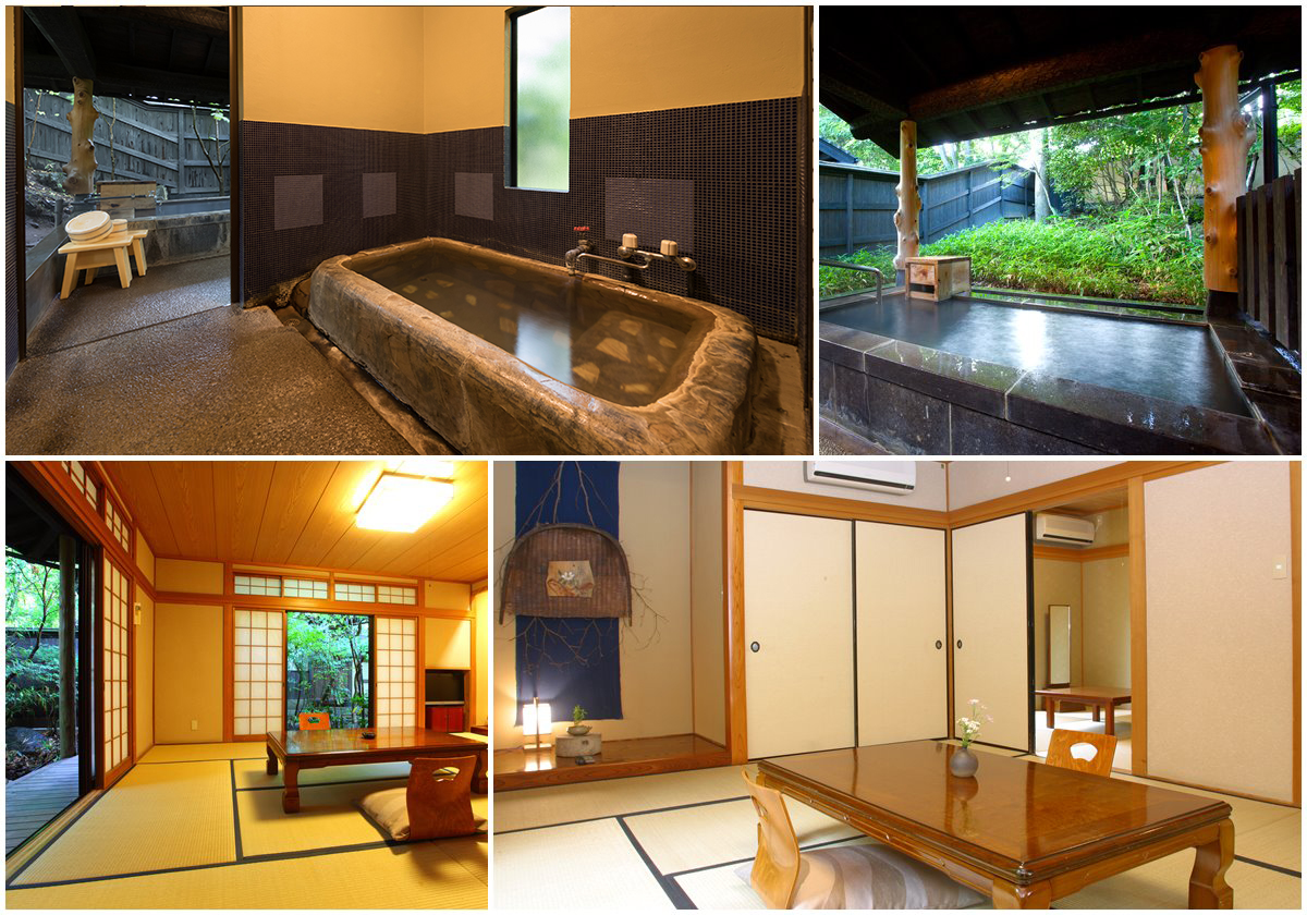These rooms feature two Japanese tatami rooms with both an indoor and outdoor bath.